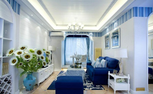 别墅装修设计中,蓝色安静忧郁的色彩。本案非常有趣,乍一看,以为设计师只是使用了蓝色,但仔细一看,其中由水平和垂直条纹拼接在一起,使天花板和下墙壁存在差异感质地,而细条纹与粗条纹营造的视觉效果,非常耐人寻味。