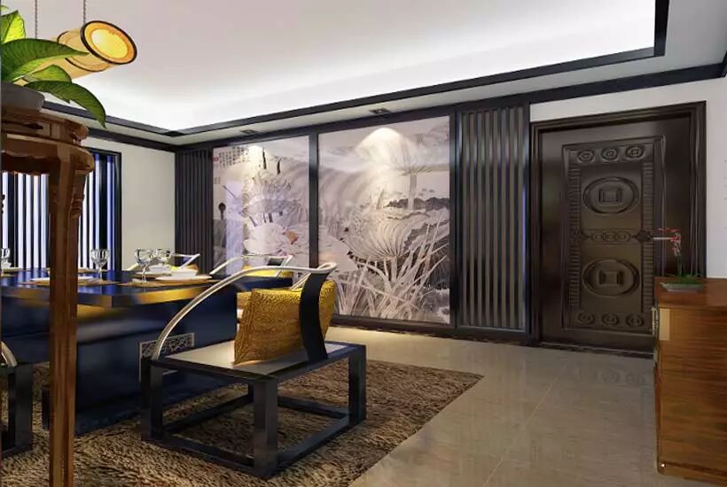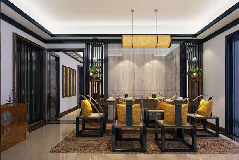新中式别墅餐厅中色彩奠基了设计的灵魂,金黄是幸福健康的颜色,温柔的明黄软靠映衬着质感光滑的座椅,调和了人们的视觉感。