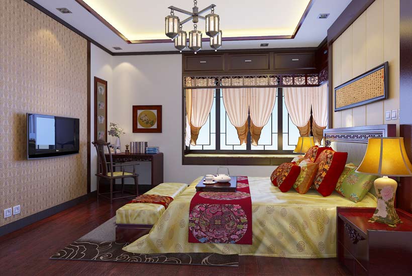 现代中式别墅卧室色调唯美,气韵宁人。传统中透着现代,居住其间惬意非常。
