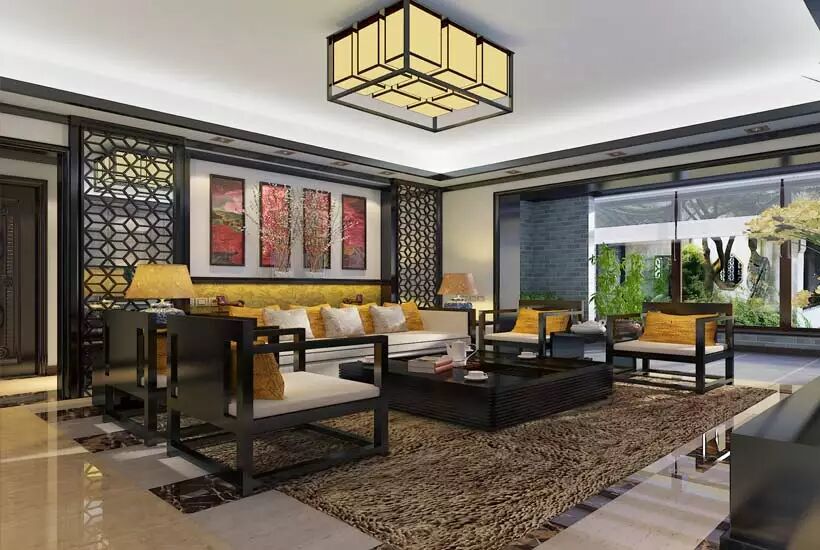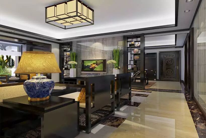新中式别墅客厅设计古朴宁静的气质,寥寥几语间,诉不尽的百转柔肠,青砖堆砌,墨色桌椅,镂空雕饰无不展现中式情结。